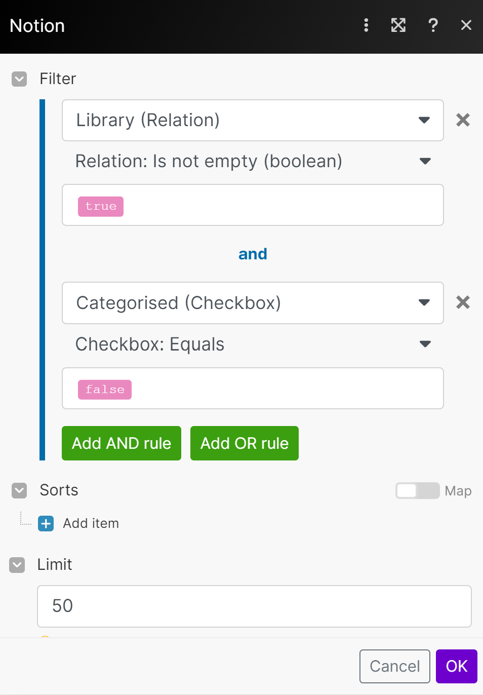 - Select your Clippings relation property and under relation select contains. In Search Items add the Page ID from Module 1 (Check Clippings Inbox).