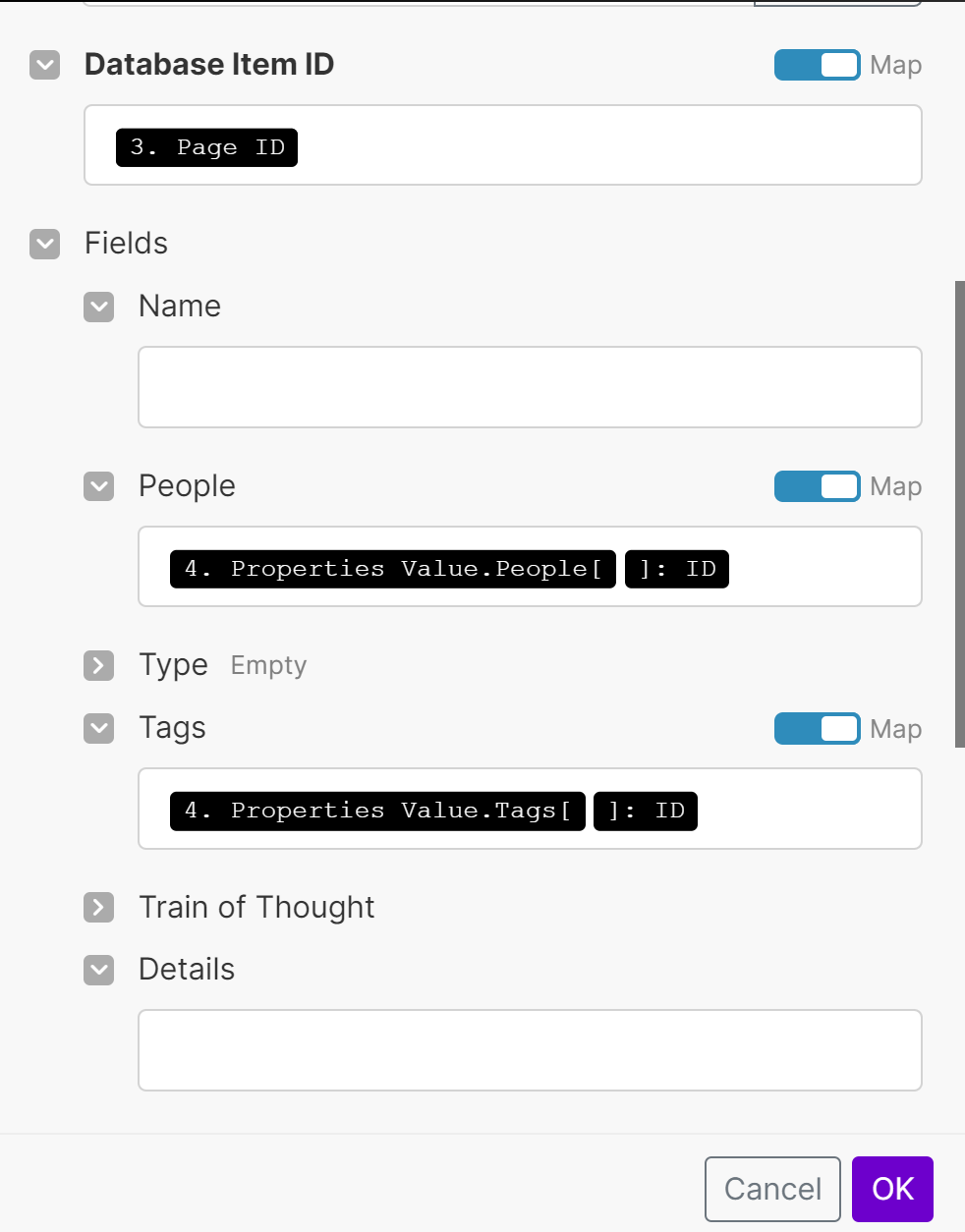 - Select the fields for the clipping you would like to update. In my case, I have chosen relation properties to my other databases; People and Tags. You can use whatever properties you want but I’ll use the People relation property as an example here.