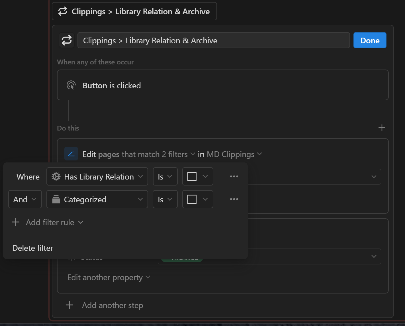 - Add filters so that the automation is looking for Clippings that have a Library relation but are not categorized.