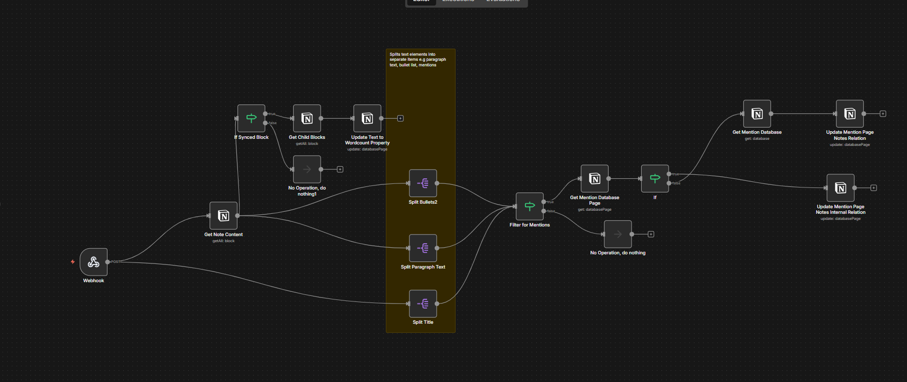 The title branch looks for page mentions in your page name. The bullets branch extracts text from every bulleted list item, checking each one for mentions. The paragraph branch does the same for standard text blocks.