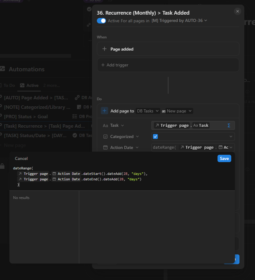 I set up a linked database view that filters for tasks that have been completed (status = done) and have a recurrence of monthly (select property = monthly). Under Do, I click Add Action, Add Page to, select my task database and map the properties needed. The mains to map are the name and the date. For the name you can simply do: Trigger Page.name (or whatever the name/title) property is called. For the date you can do the following: Trigger Page.YourDateProperty.dateAdd(28, “days”). This will create a new task with the same, scheduled 28 days after the previous task is completed. You can create different automation for different recurrences and adjust the days added accordingly.