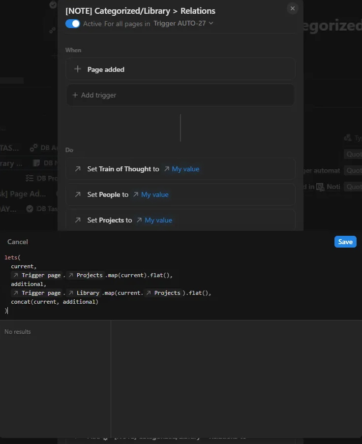 This seems to work great. It takes whatever projects the library resource is related to and applies that relation to the note. However, what if this note was already related to another previous project? This automation would overwrite that and only the library related project would appear here. I updated the formula to capture the projects related to the library and the projects already related to the note and then relate this updated list to the note.