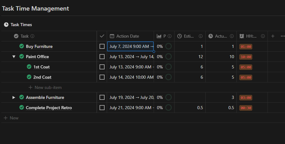 The estimated and actual time properties really come into play when I'm reporting my project progress. So, as opposed to just using a rollup that looks at how many tasks are complete versus incomplete, I'm able to weight the tasks by time taken. So, I have the formula set up in such a way that when a task is done, it's recording the actual time taken to complete a task. Then, when a task is incomplete, it's referencing the estimated hours value. I found this really helpful because it means that I don't have to time block every individual task at the start of a project to get an accurate progress completion percentage. I can just add an estimated hours value and that will give me a rough idea of how far along in the project I am. Once I start completing tasks that have been time-bound, the formula is updating based on the actual time.