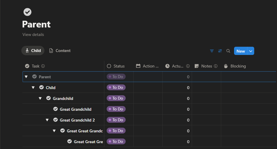 With Notion sub-tasks, every page in your database can have a Parent/Child relationship. Think of it like a folder inside a folder. A task might have a parent task, which itself may have a parent task (grandparent) and all of those tasks may be related to a larger project.