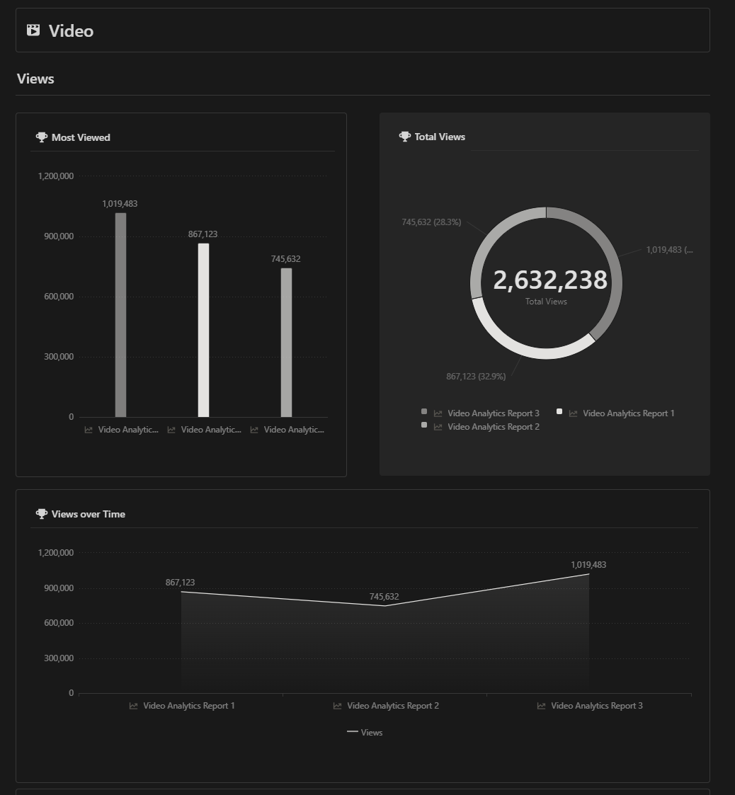 The Analytics dashboard uses Notion’s chart feature to visualize data from the associated databases. It’s a create way to track the amount of content you are publishing but could also be used to capture more channel specific statistics.