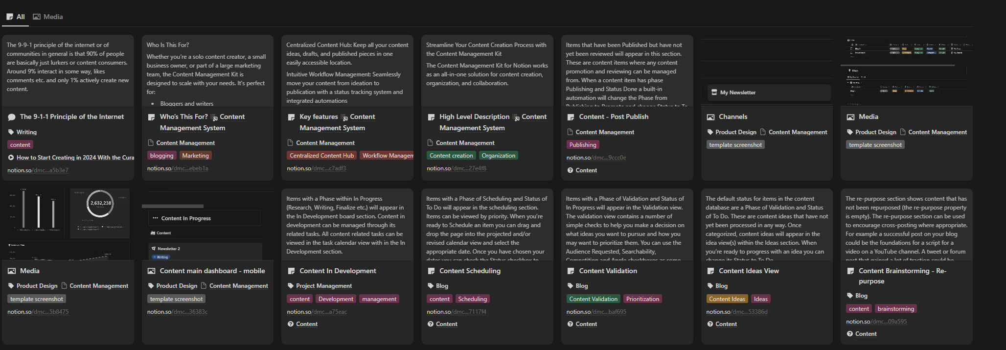 The focus of this post will be on the content management side of things but the true potential of a system like this, is how it interacts with your knowledge management system. So before we dive into the weeds of managing a content calendar let’s look at how these systems interconnect. Take the quote I mentioned at the beginning, on the The 9-1-1 Principle of the Internet as an example. I came across that concept months ago, in a video called How to Start Creating in 2024 With the Curation Method by Tiago Forte. I took a note of it, because I thought it was interesting but didn’t necessarily know what I was going to use it for. When it came to researching for this post, I was able to dive into my notes, filter my tags and keywords related to content management etc. and this one surfaced to the top. I can click on the note content contained within a synced block and see where it’s sourced from and where else I’ve used it, at any time. This let’s me see those connections at a block level as well as at a database level.